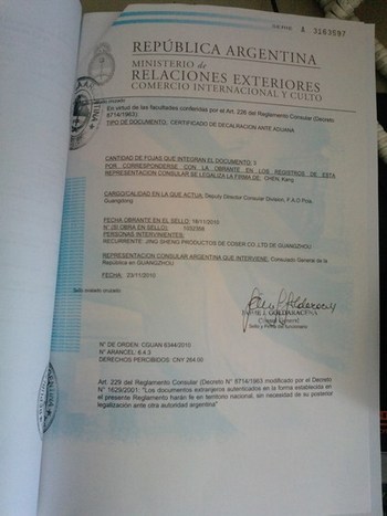 阿根廷使馆认证就是出口阿根廷需要阿根廷大使馆外交官审核盖章的需要签字盖章,凡是不是海牙公约国都需要办理使馆认证,使馆认证也是算算认证的一种必须经过,国家外交部审核盖章,才能发到阿根廷驻华大使馆,公司要办理得去贸促会备案注册先,也可以找代理提供箱单和发票即可!然后出证后交由贸促会递交到外交部,外交部递交到阿根廷领事馆·当地贸促会认证------总会---外交部----领使馆,需要这3个部门点击打开链接